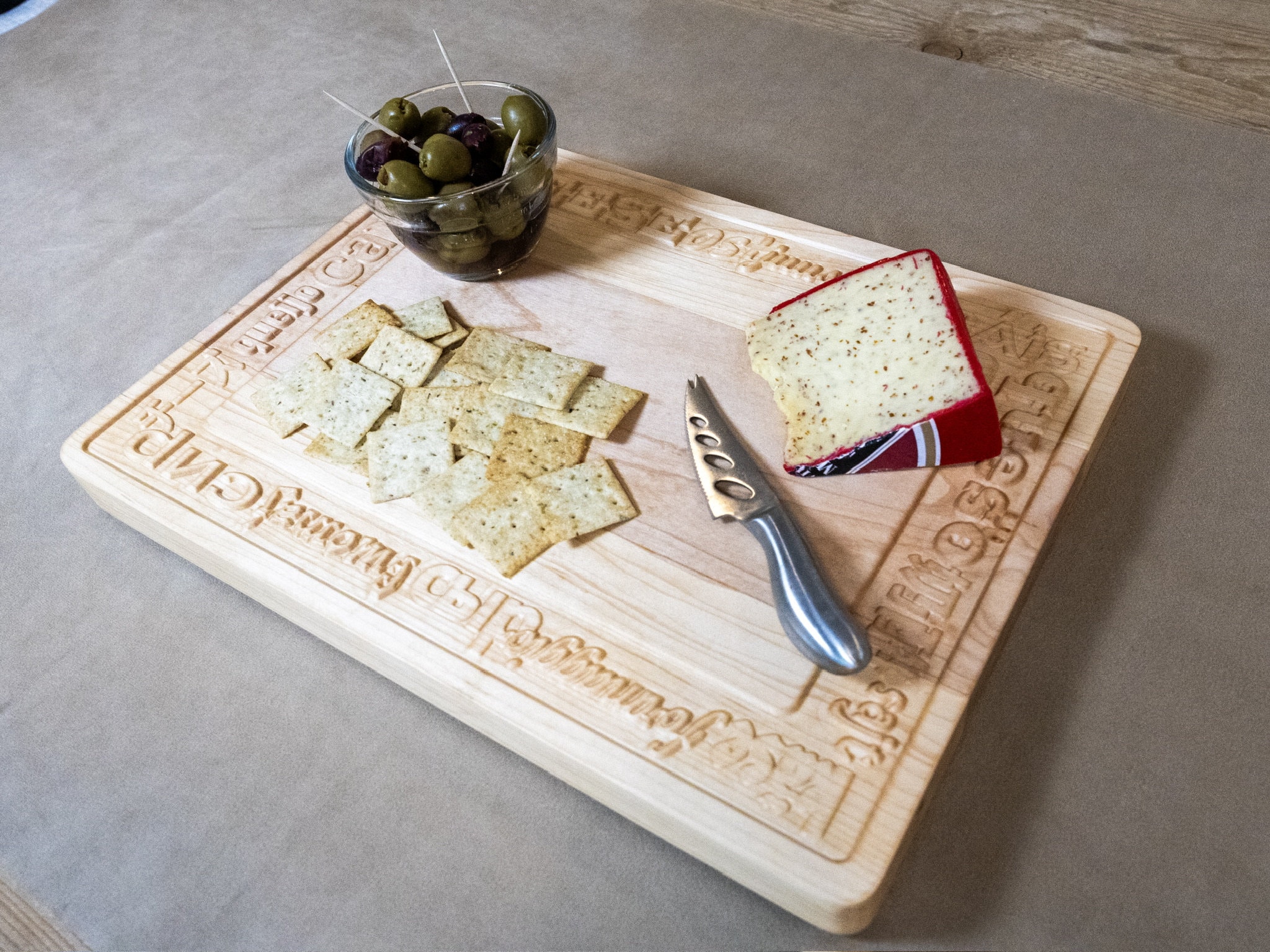 This wooden cheese board is like no other. It is an original design that makes an heirloom-quality gift for weddings, anniversaries, or any occasion worth celebrating. The gourmet character of this original design will delight any foodie. This beautiful tray makes a meaningful, lasting present that will be the talk of any party. And...we can engrave your personal message on the bottom of the board.